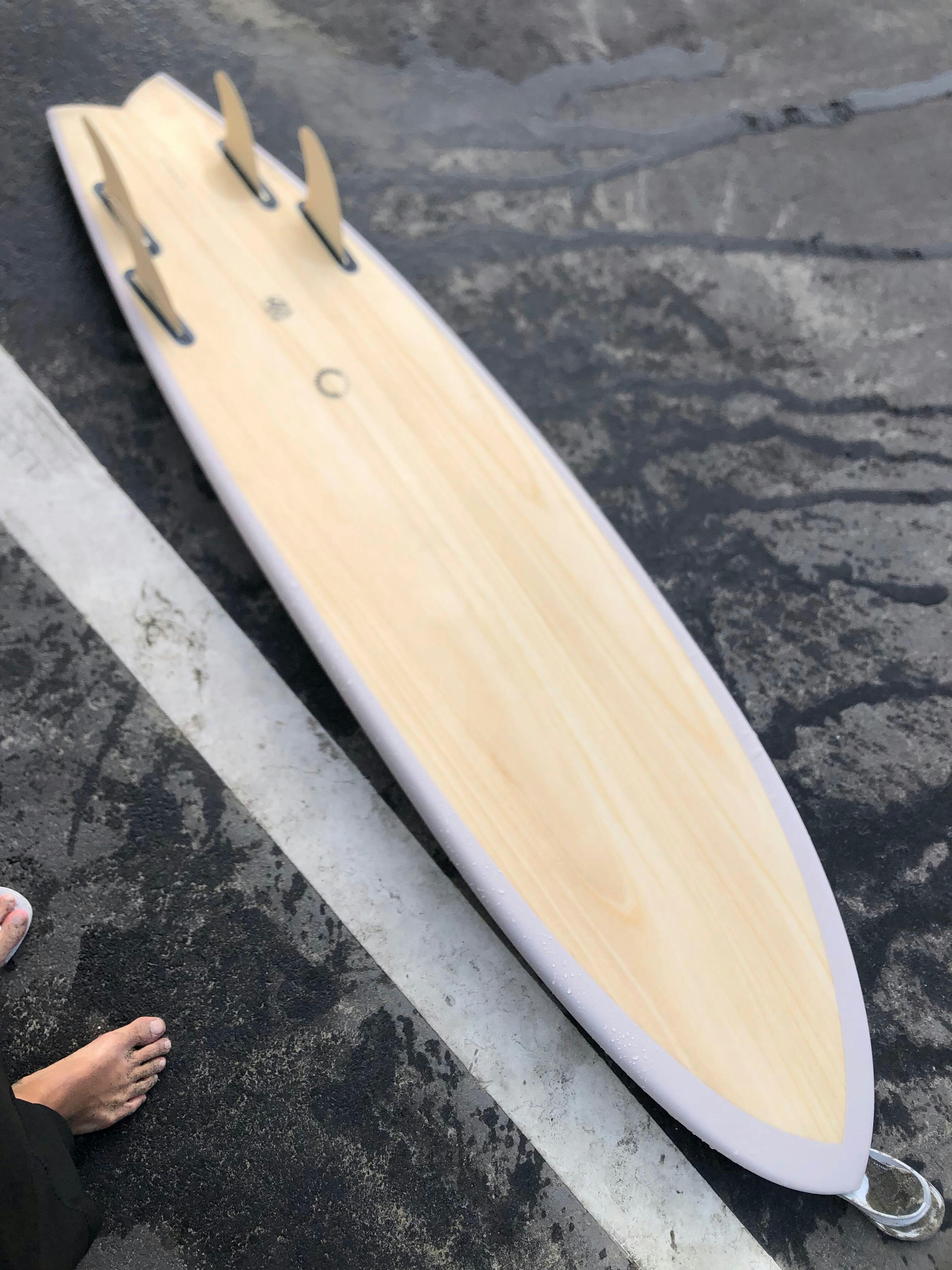 2層のファイバーグラスに加え、極薄の天然木をバキュームバッグ技術で圧着することで、丈夫で長く使える軽量サーフボードを実現。